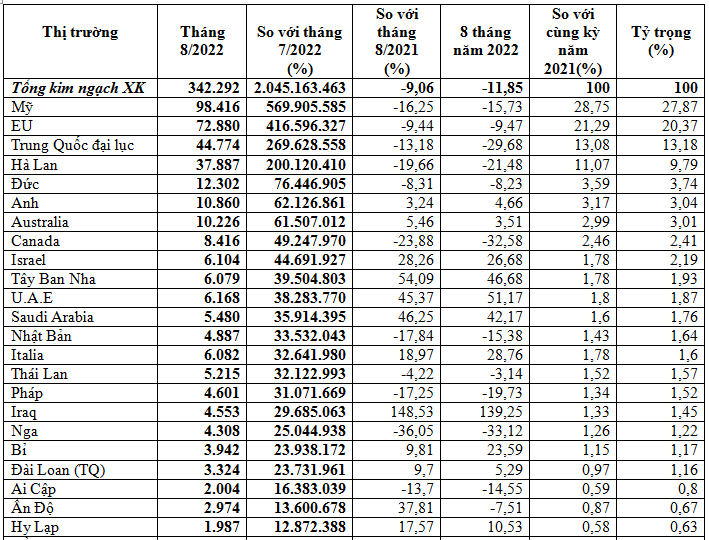 Thị trường xuất khẩu hạt điều 8 tháng năm 2022